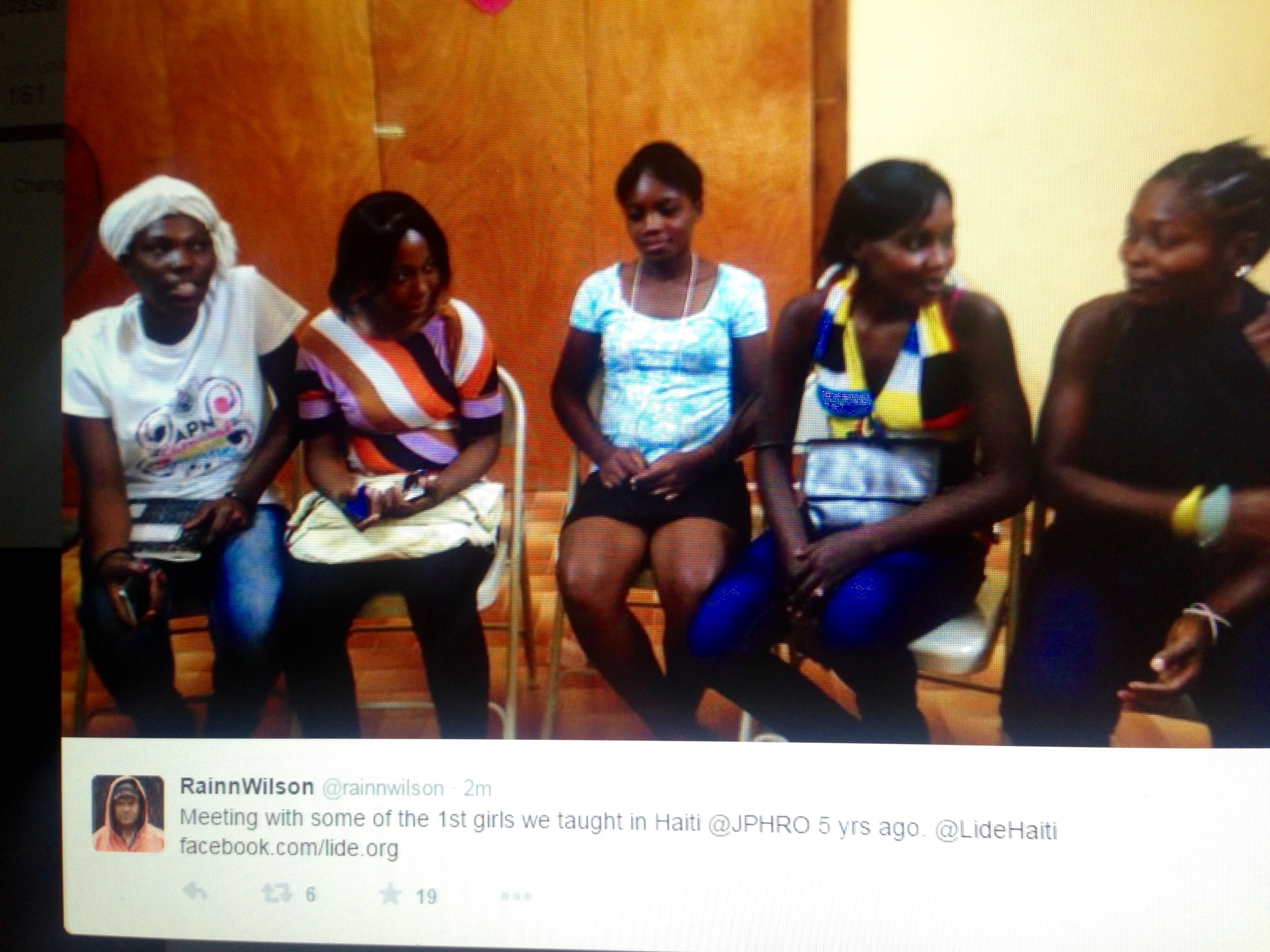 The tweet: @rainnwilson “Meeting with some of the 1st girls we taught in Haiti @JPHPRO 5 yrs ago @LideHaiti www.facebook.com/lide.org”